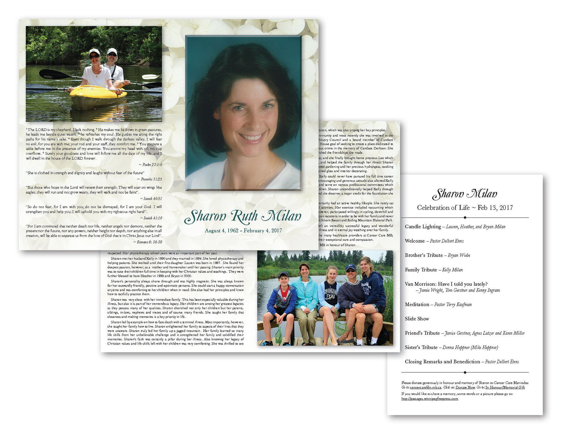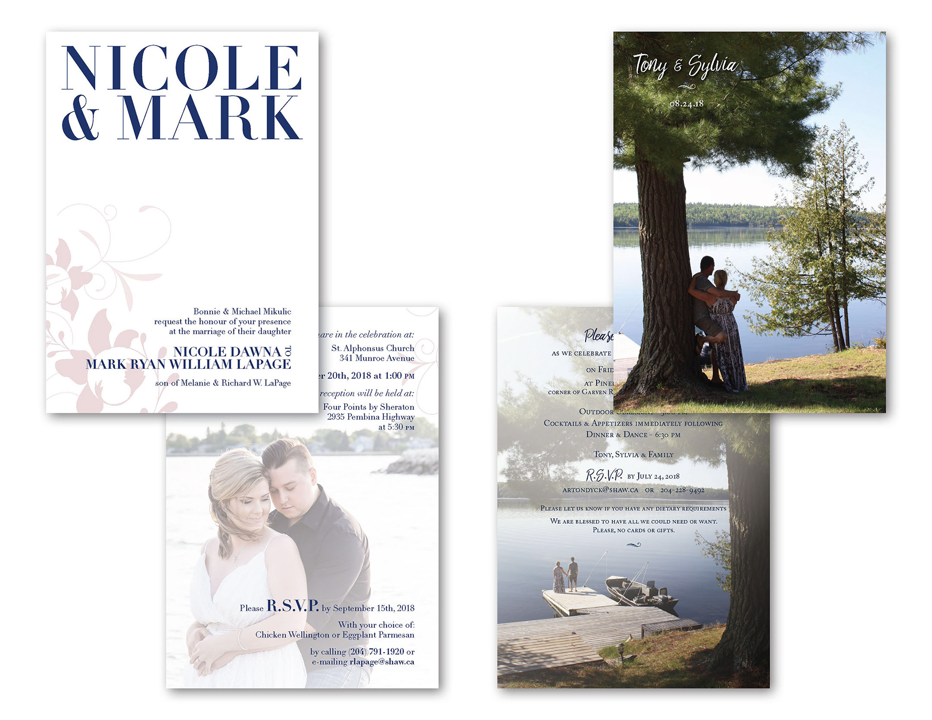 Various wedding invitation designs, plus RSVP card and envelope, and funeral program with insert. Photos supplied by clients.