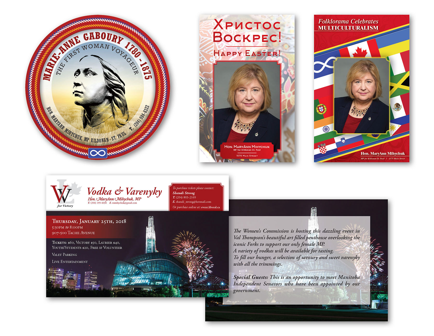 Various design projects for Manitoban MP, including postcards, posters, and pin-back button.