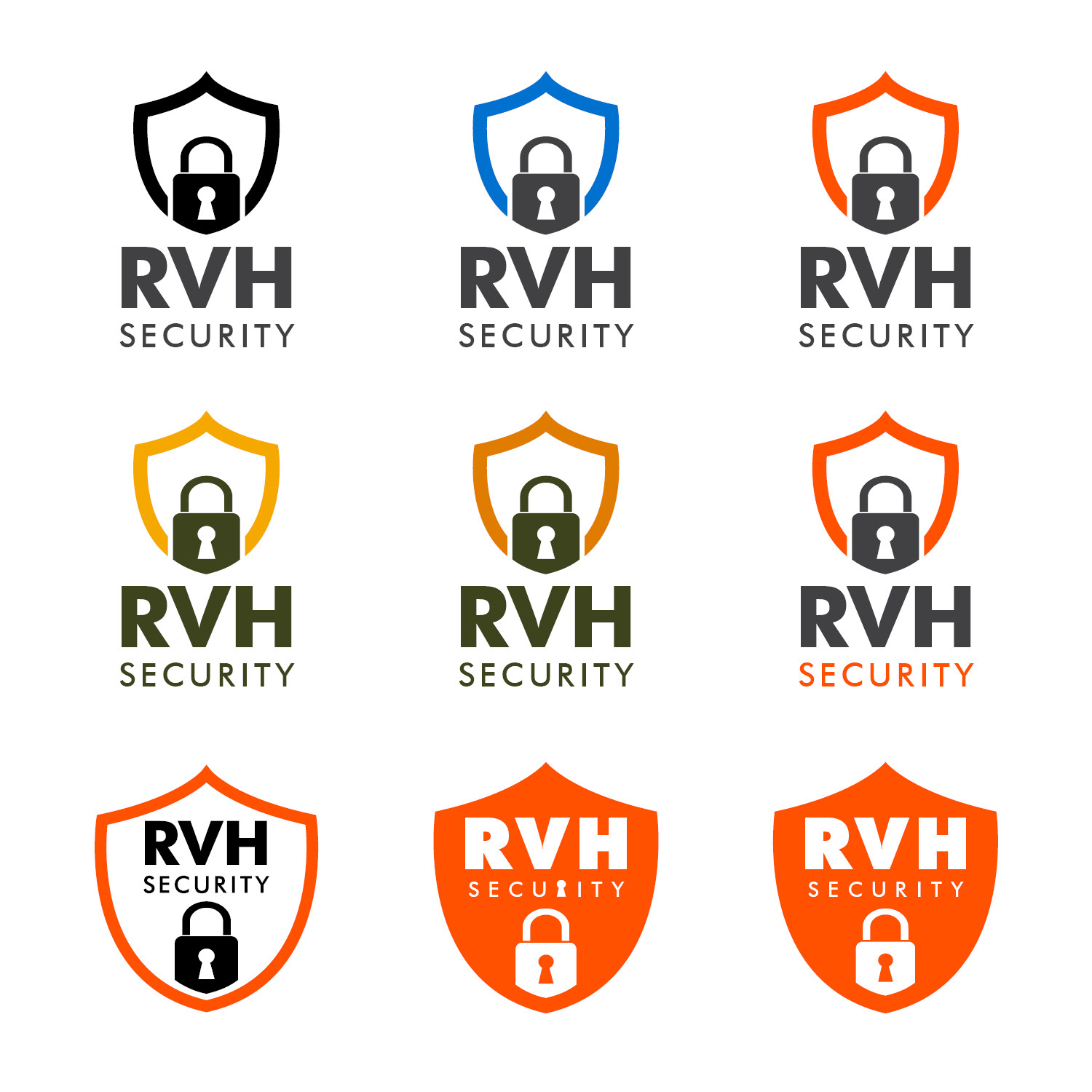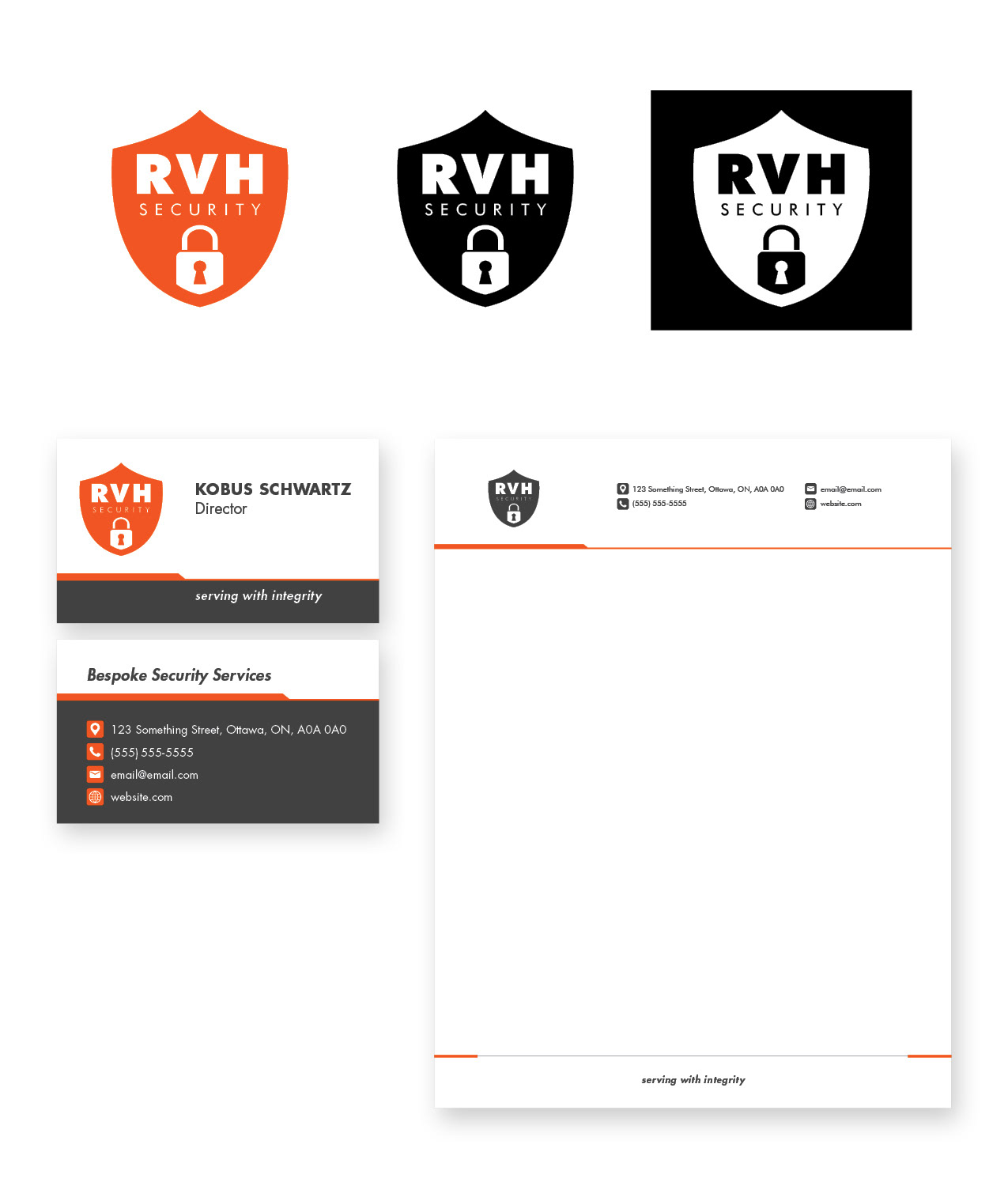 A logo, business card, and letterhead design for a security company. Final designs, as well as logo exploration process.