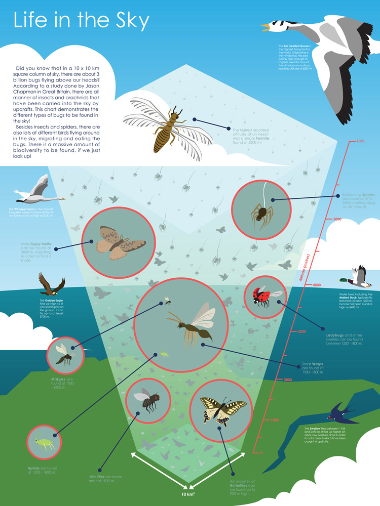 Illustrated infographic explaining the amount of life in the sky above our heads.